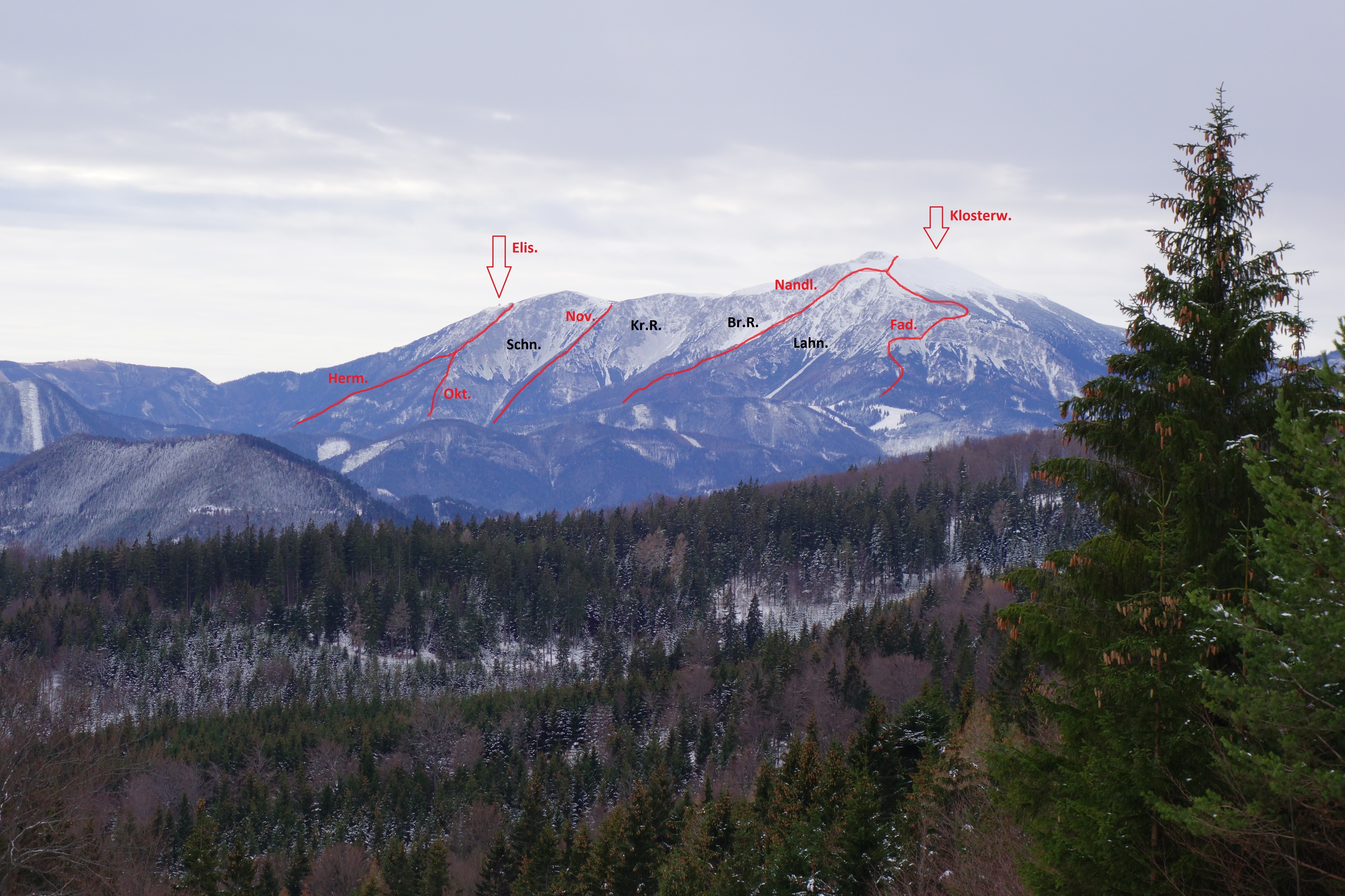 A Schneebergland összetevői a Schneeberg, a Kuhschneeberg, Krummbachstein, Mittagstein, Gahnsleiten és a Dürre Leiten mely a Dürre Wandban folytatódik, de az már Gutensteiner Alpen része. Az alábbi képhez tartozó jelmagyarázat itt: “Kis magyar Schneebergtan”. Pirossal a főbb feljutás útvonalai a hegy északkeleti oldalán. Kattint a képre a teljes felbontáshoz.