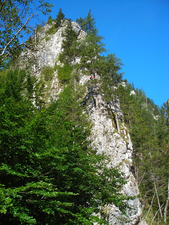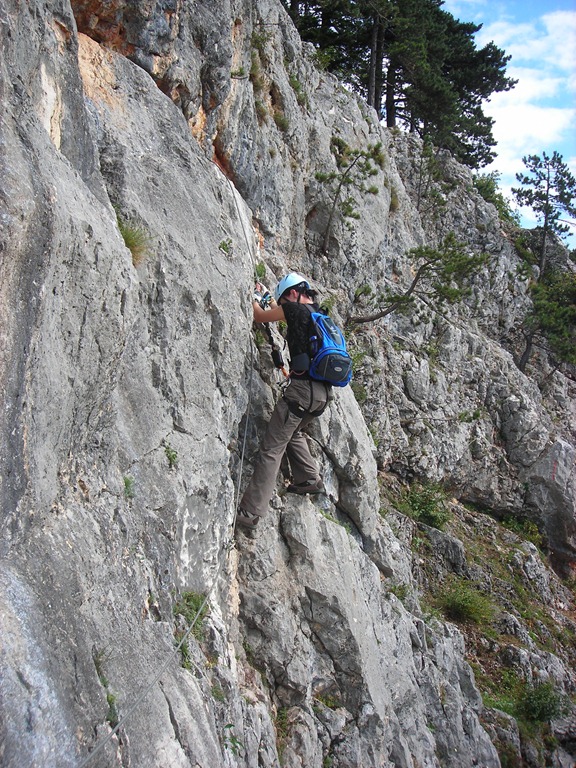 A kiindulás és a kletterezős szakaszok (Vordernberger Mauern), állandó kaptató, majd váltakozó fel és lefelé vezető részek. Egyensúlyozás a szakadékok szélén. Egy három főből álló, futócipős, könnyen öltözött, mini hátizsákos csapat húz el előttem. Nincs kletterező felszerelésük. Így is lehet a vakmerőknek és a nagy menőknek. Én az első drótköteles szakasz beszállója előtt felveszem a beülőt és a kantárt. A Fahnenköpfel alatti első igényesebb szakaszig azonban nincs rá igazán szükségem. Majd a kulcsfontosságú C szakaszon jól jön, illetve ez után is még kétszer igénybe veszem az önbiztosítás adta lehetőséget. El tudom viszont képzelni, hogy a rettenetesen nagy profik felszerelés nélkül is elboldogulnak.