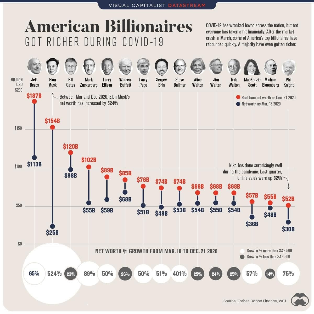 Kinek használ a jelen áldatlan állapot? Tessék megnézni, mennyivel lettek gazdagabbak kilenc hónap leforgása alatt a leggazdagabbak, miközben a kisemberek a túlélesért küzdenek! Alsó sor az induló tőke nagysága (2020 március 18.), felső sor, pirossal a 2020 december 21. állás.