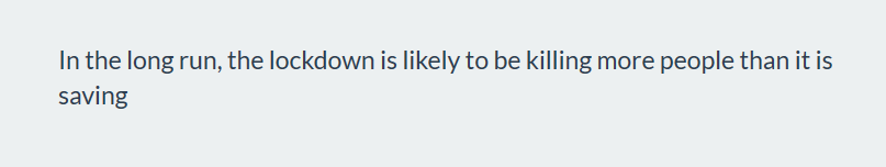 Más tanulmányok hússzor kisebb halálozási arányról beszélnek és a Bécsi Orvosi Egyetem tanulmánya (mely a sajtó minden ingerenciája ellenére egyre ismertebbé válik) pedig a rendes évi elhalálozások tükrében nem lát bizonyítékot bármiféle fokozott rizikóra. A tenor, mely lassan-lassan, de mégis a felszínre tör, azt mondja, hogy nincs bizonyítható alapja a jelenlegi rigorózus megszorításoknak. Amennyiben van is különféle okokra visszavezethető normaérték feletti elhalálozás, az nem olyan mértékű, mely nyomán megalapozott lenne egy totális lockdown. Megjegyzendő, hogy Boris Johnson egészségi állapota bár adhat együttérzésre okot, akkor is csak egy eset marad a sok többi közül és az ezzel kapcsolatos fent említett tanulmányok értékét nem kisebbíti.