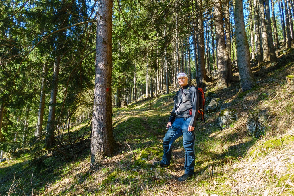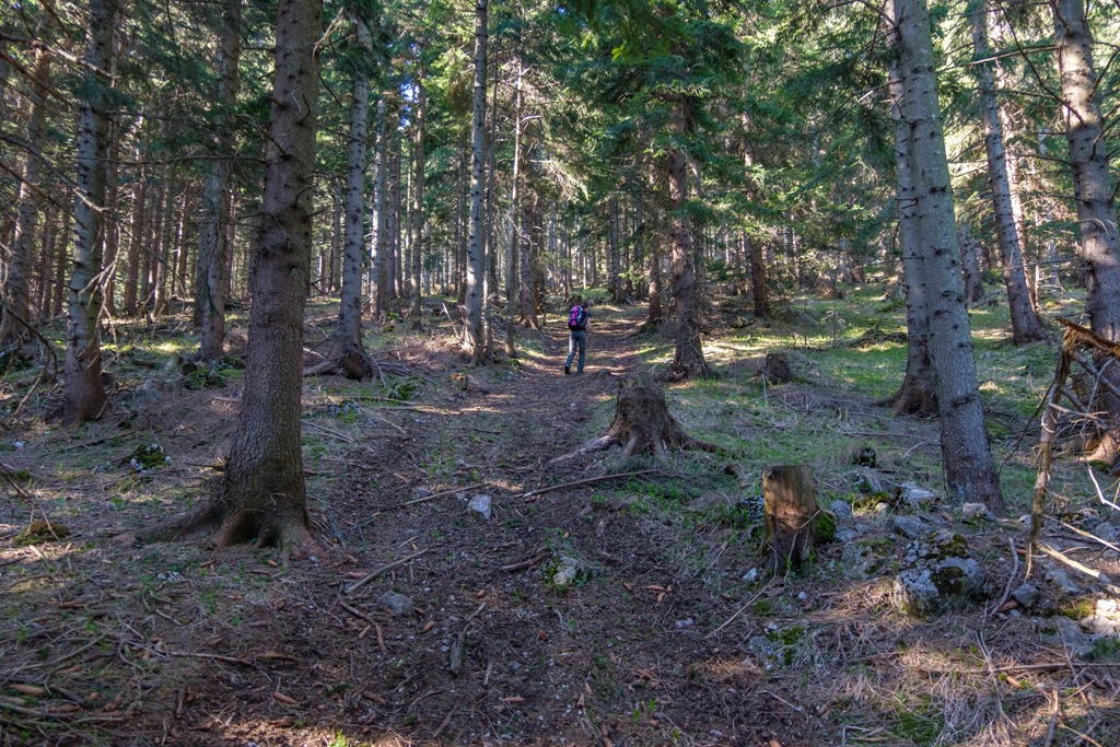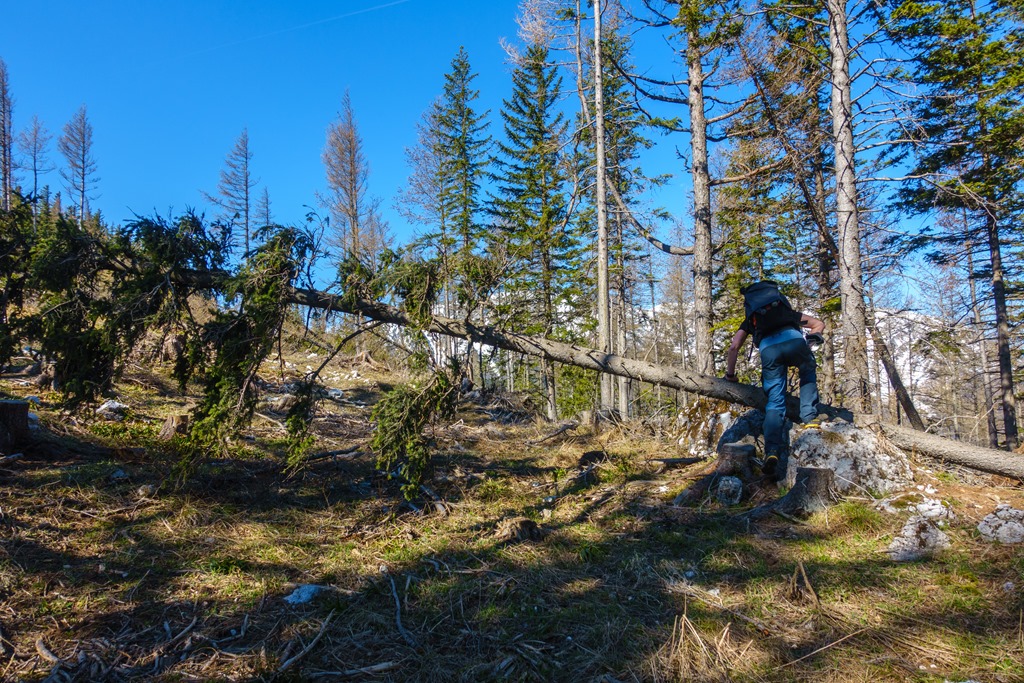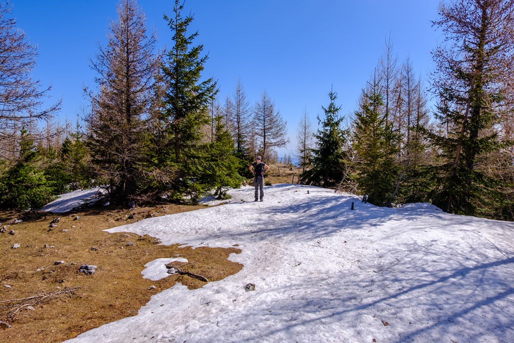 Örömünkre szolgál, hogy az Edelweißhütte feletti fenyőerdő leárnyékolja a nap már kora reggel is jól érezhető hevét. Ennek azonban hátrányai is vannak, tudniillik a hó puha állaga fagyos jéggé mutál. Mi pedig lustaságból, illetve abból a meggondolásból nem vesszük fel a hágóvasakat, hogy az erdős szakaszt követő Alsó Fadensteigen úgysincs jég, elég lesz majd csak a Felső Fadensteig előtt felcsatolni a vasakat.