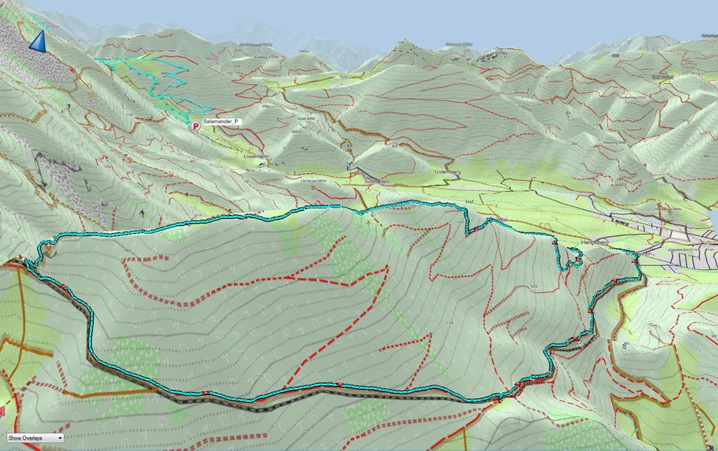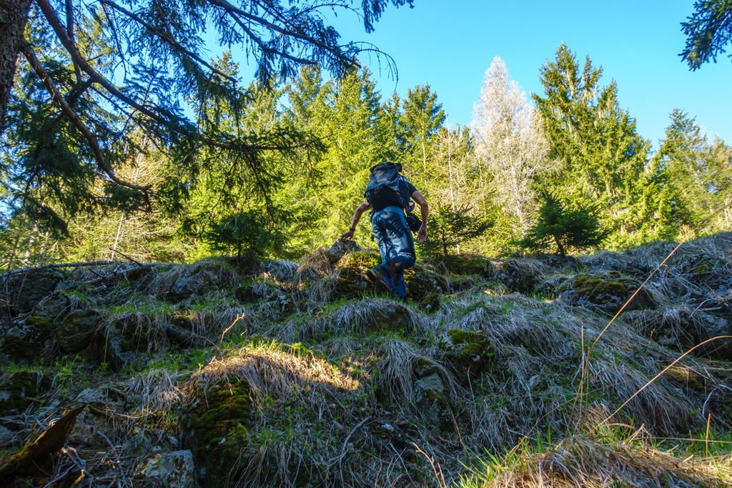 Az Almgatterl tájékán (13:50 – fenti kép) kicsit izgulok a nedves hólavinák miatt. Tudniillik itt kétoldalról meredek lejtők szegélyezik a Fadenweget. Kémlelem a terepet, de valódi veszélyre utaló jeleket szerencsére nem sikerül felfedeznem. Az út jobboldala feletti részek is nagyrészt már hómentesek. A behavazott erdészeti utat viszont egy majd 45 fokos, tömör hóréteg fedi, amin, hótalpakon kifejezetten bokaficamító a menet (lenti kép). Némi küszködés után aztán újra hágóvasakkal próbálkozunk (lenti kép), ami valamelyest segíti a könnyebb haladást, de a boka ízületek így sincsenek kímélve.