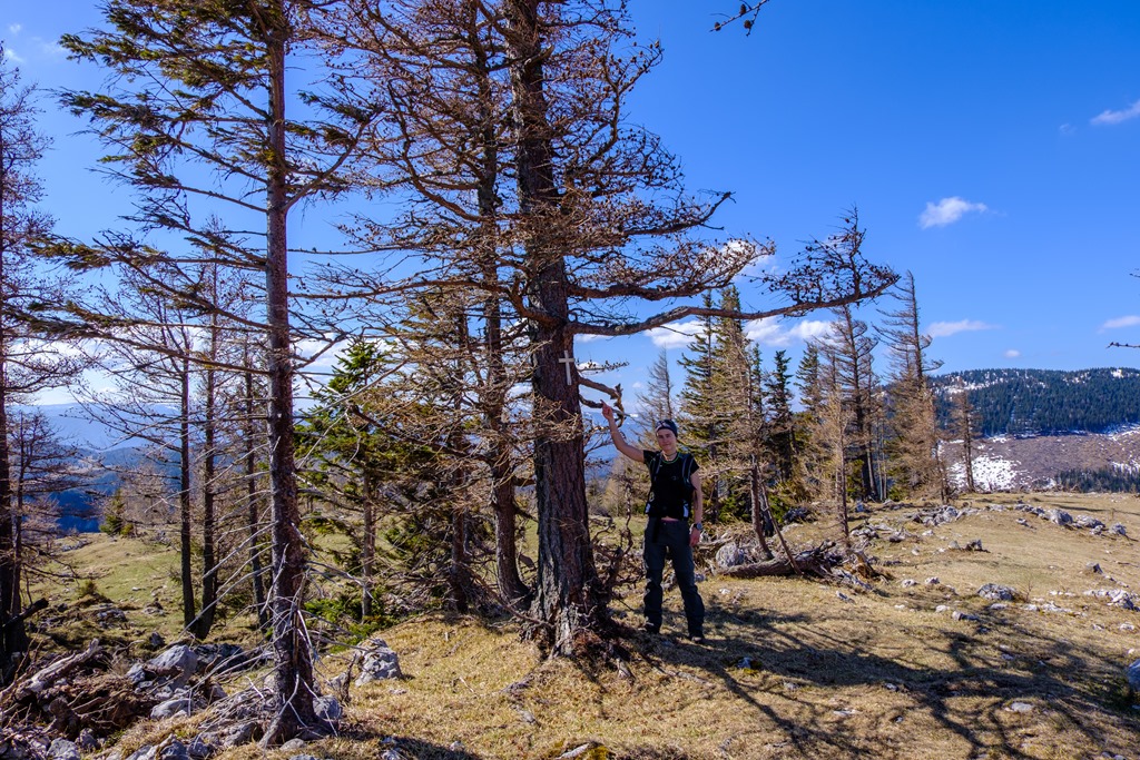 11:30-kor érjük utol a Fischerhütte tövében türelmesen várakozó Cirmit. Nincs még dél (11:50), mire a csúcskereszthez érünk, amiről sajnos, a hat hete még oly csodás jégvirágok leolvadtak. Ez azonban egyáltalán nem csorbítja érdemeinket. Remek az idő, kívánni sem lehetne jobbat. A langymelegen ragyogó nap melegét időnként kellemes hűvös fuvallatok ellensúlyozzák.