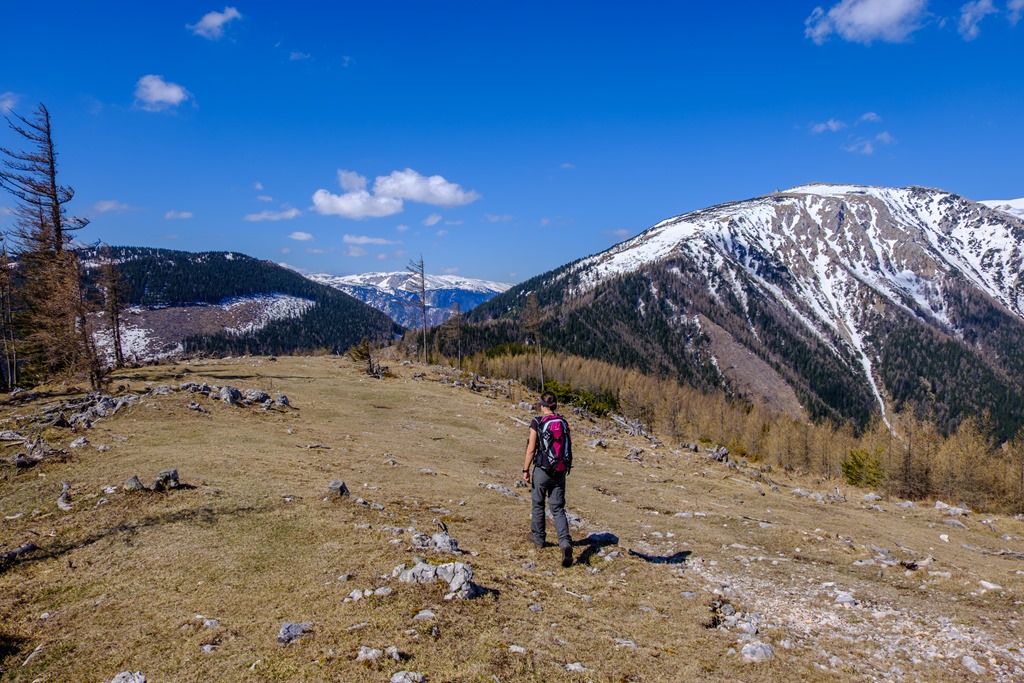 A platón (10:22) őszi száraz fű és langymeleg napsütés fogad (fenti kép). Bár feljebb jól láthatóan újra összefüggő a hóréteg, úgy döntünk, a hágóvasakat el lehet csomagolni. És ez így is van rendjén. Cirmi lehagy minket és 10-12 perces előnnyel érkezik a Fischerhüttehez. Mi Attilával útközben, néhány megcsúszás után arra a nézetre jutunk, hogy hótalpakon valószínűleg könnyebb a menetelés, és akkor a hátizsákot sem nem húzzák. Ez valóban be is igazolódik.