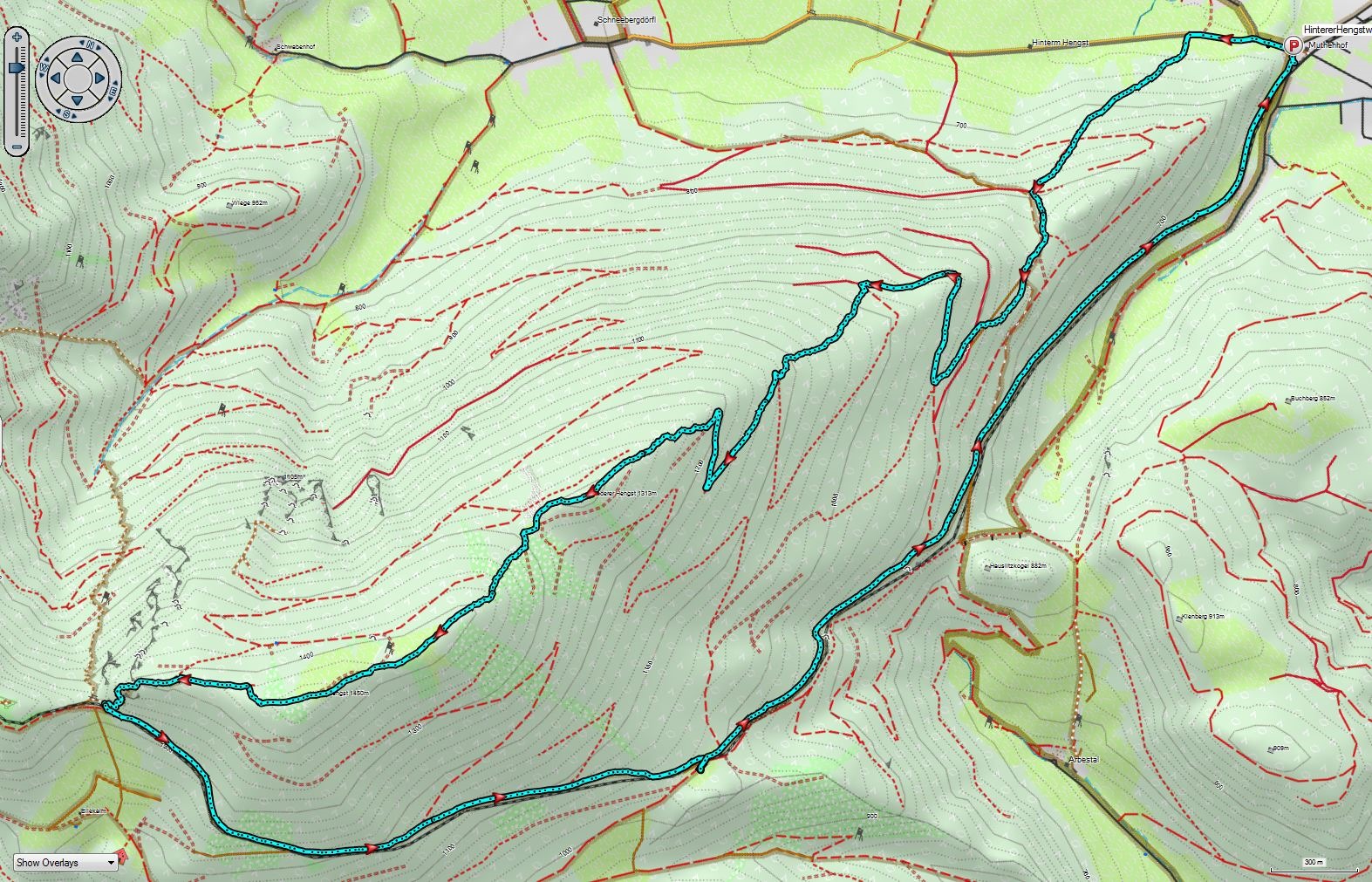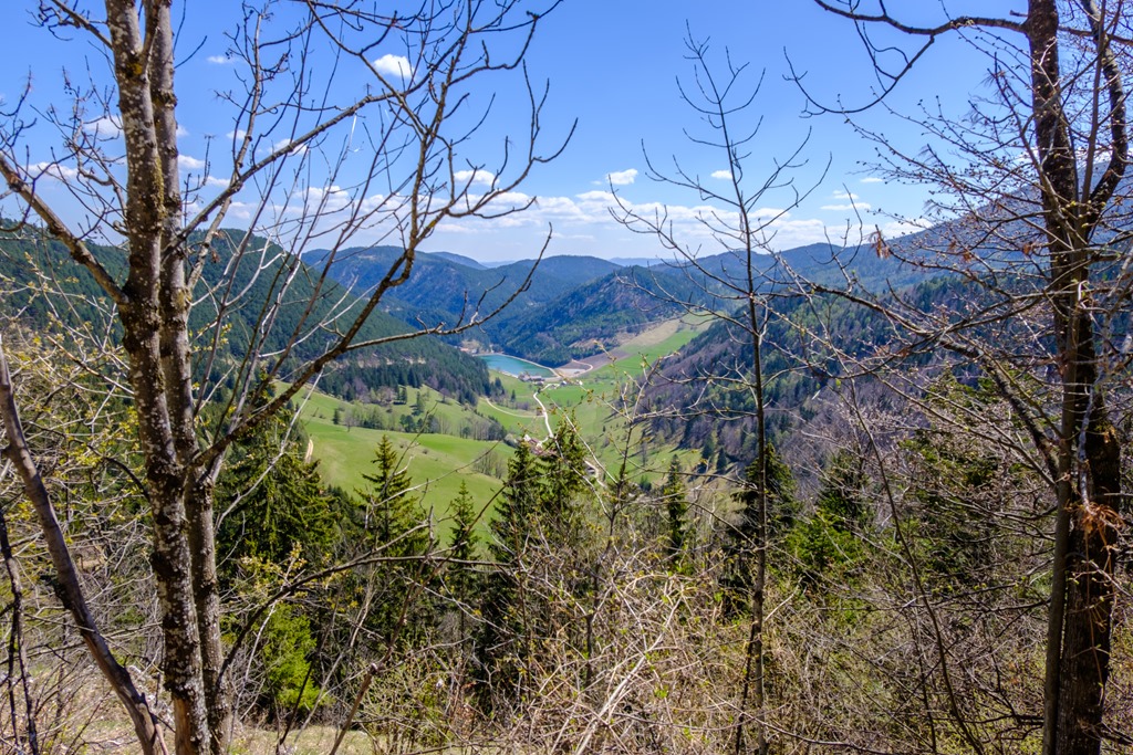 A kötelező fotózás után a Schauersteinen át kezdjük meg az ereszkedést. Bár a Schauersteinen már sokszor jártunk, az ösvény névadója csúcsán még soha. Nosza, ezt most pótoljuk (12:45) és felmászunk a sziklaszirtre (fenti képek, kilátás a szirtről a megtett útra). A továbbiak, a térdízületeket nem kímélik, vaskarmos hótalpaink ellenére kicsúszásokkal is tarkítottak. Fellélegzünk, amikor végre elérjük a jóval simább terepet kínáló Fadenweget (13:15).
