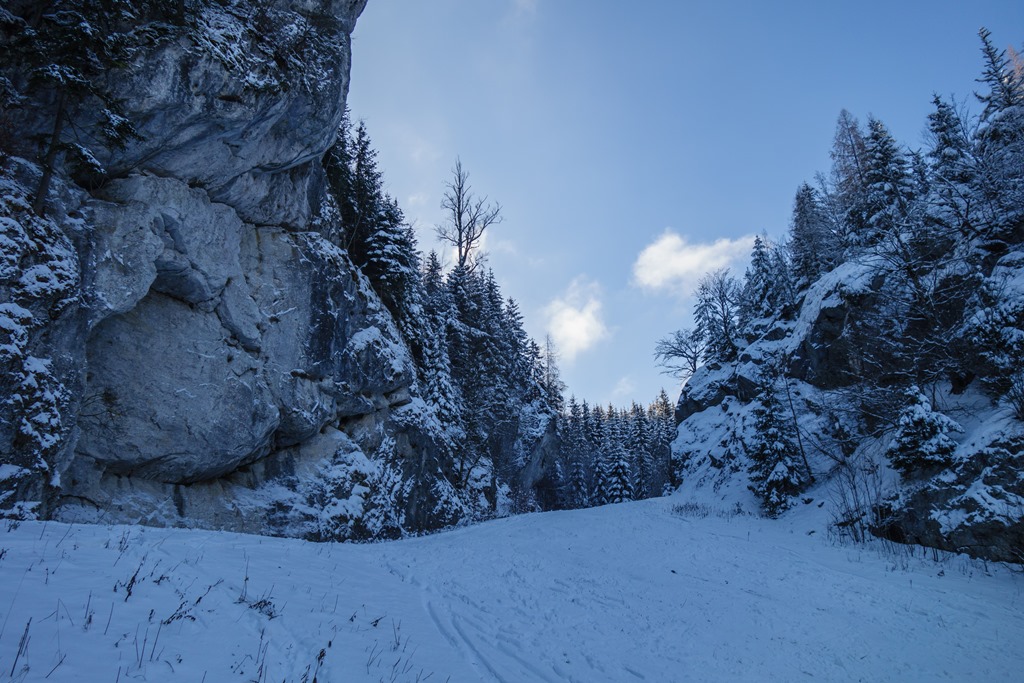 Az út végére a Fözklamm és a Fölzbach patak teszik fel a pontot. Odafenn még trikóra vetkőzve sétálgattam a langymeleg platón, itt meg minden egyes lefelé tett lépéssel zuhan a levegő hőmérséklete. A napot már régen nem látni, mert leárnyékolják a sziklák. A könnyű acélkék árnyalatban csillogó patak jéghideg lehelete pedig egyre határozottabban gyűrűzik be a pulcsim mögé. A szurdokot egyre szorosabbra záró sziklafalak tevéből elfogy az ösvény is, minek következtében a patak fölé szerkesztett palló segítségével lehet csak áthidalni a természet szabta akadályt (14:45).