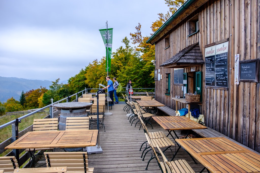 A teraszon nincs senki, ami érthető, hisz napfény hiányában az északról lebbenő szellők elég kellemetlenek. Odabenn jóleső, kellemes meleg fogad és a kicsiny belső tér ellenére még szabad asztalt is találunk. Félórás ebédszünet után 11:45-kor távozunk, ami egyben a tömegek Kieneckre irányuló rohamának kezdetét is jelenti. Az Enziansteig felé vezető letérőig (12:20) pontosan 28 túrázót számlálunk meg, akik kisebb-nagyobb csapatokba verődve nyomulnak a menedékház felé. Mintha csak összebeszéltek volna. Ha tehát vasárnap és Kieneck, akkor korán kell érkeznie annak, aki kényelmesen szeretne itt helyet foglalni (lenti kép == már amennyiben betérni kíván). Nekünk speciell, korai érkezőként, szerencsénk volt.