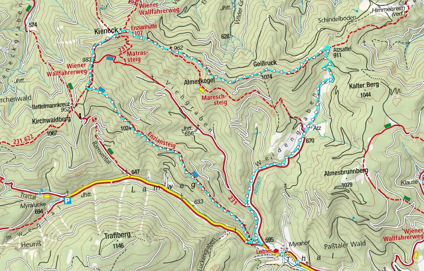 Menetelésünket számtalan kisebb-nagyobb emelkedők és lejtők sorozata tarkítja. 10:28-kor érkezünk a Geißruckra (1024m) majd 11:15-kor már a Kienecken lévő vendégház tövében vagyunk (indulástól számítva 2:35 óra alatt).
