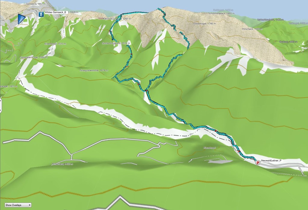 A táv (Riesachfall, Gollingerhütte, Greifenberg, Klafferkessel, Preintalerhütte, Gfölleralm, Riesachfall) 22.2 km, 1640 m szintemelkedés bruttó 9:45 óra alatt |