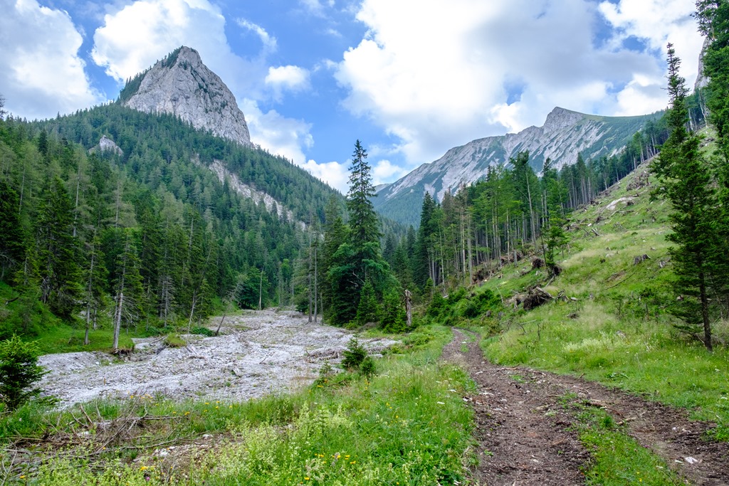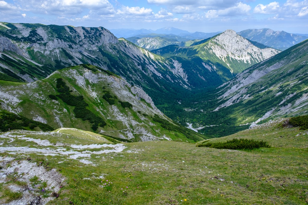Némi fotózás és nézelődés után megkezdem az ugyancsak kellemetlenül meredek ereszkedést a Klafferkesszelbe. Az ösvény a Greifenberg gerincét követi jobbról. A piros jelzés nem egyértelmű, ezért jobb tudni, hogy a lefelé vezető utat nem a gerinc bal oldalán kell keresni.