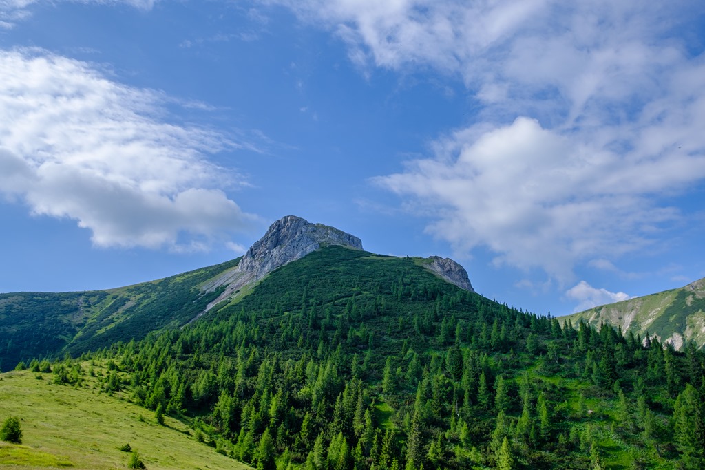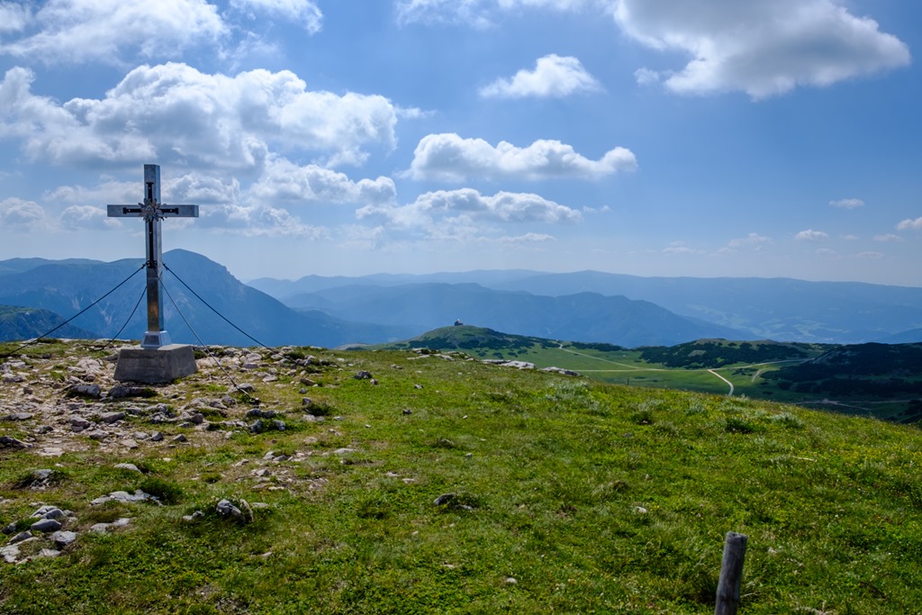 A sziklák között itt föként zuzmók tenyésznek. A fű egyre gyérebb látvány. 25 perccel később, 10:25-kor érem el fő célom, a Greifenberg csúcsát. Le vagyok nyűgözve a látványtól. A kilátás tökéletes. Északi irányban a Dachstein, délre a Tauern káprázatos panorámája a fáradalmak jutalma.