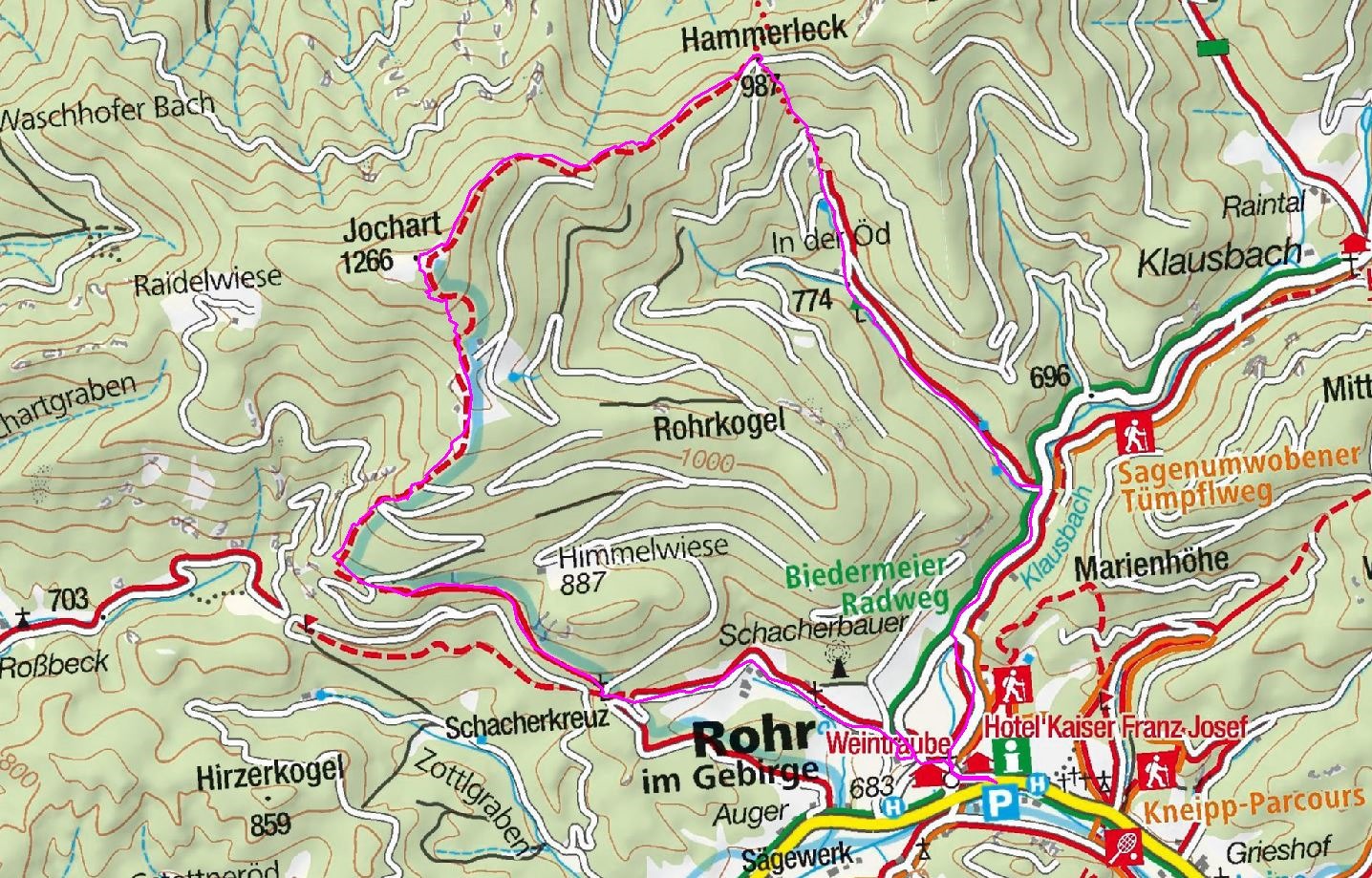 Alternatíva az Obersberg. Már sokszor hótalpaztam ott, de valahányszor a standard keleti ösvényen, mely Schwarzau im Gebrige centrumából, a templom tövéből indul. Van egy másik út, mely délkelet-délről kanyarodik fel a hegyre. A célom tehát, ezen a napsütötte útvonalon feljutni a csúcsra. 8:40-kor indulok.