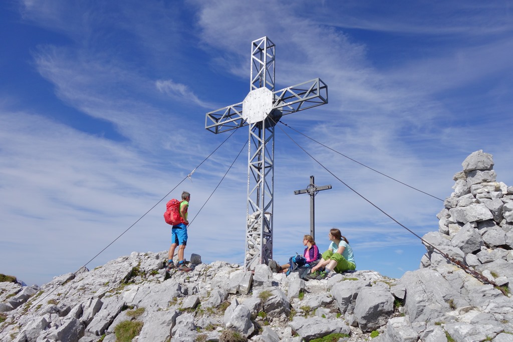 A leágazás után az út jellege még egy jó darabon az Ebersangerhez hasonlatos, bár a kaptató borsos-paprikás (tüdőlebeny köptető, ahogy mondogatni szoktam olykor-olykor). Végre megpillantom a Planspitze szikláit és mintha a csúcskereszt is megcsillanna a napfényben.