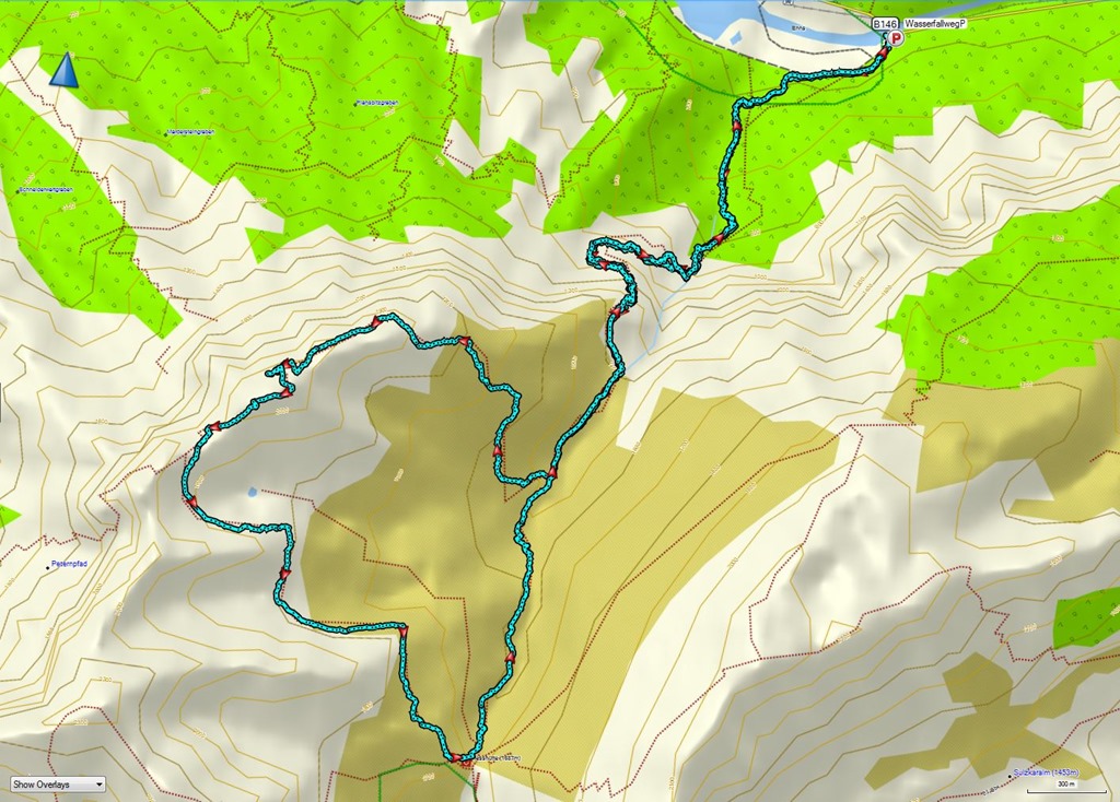 Valahol a Wasserfall alatt (7:50) végre kilépek a köd zónájából, de északi útról lévén szó, napsütésre hiába áhítozom. A vízesés közvetlen tövébe érve nem árt tudni, hogy a turistaút első pillantásra nem evidens folytatása a patakon át (gázló, vízmentes bakancs ajánlott) jobbra vezet felfelé, közvetlenül a sziklafalak alatt. Ezt azért mondom, mert a víz eróziója nyomán, a sziklára festett jelek eléggé kopottasak és elsőre el lehet őket véteni.