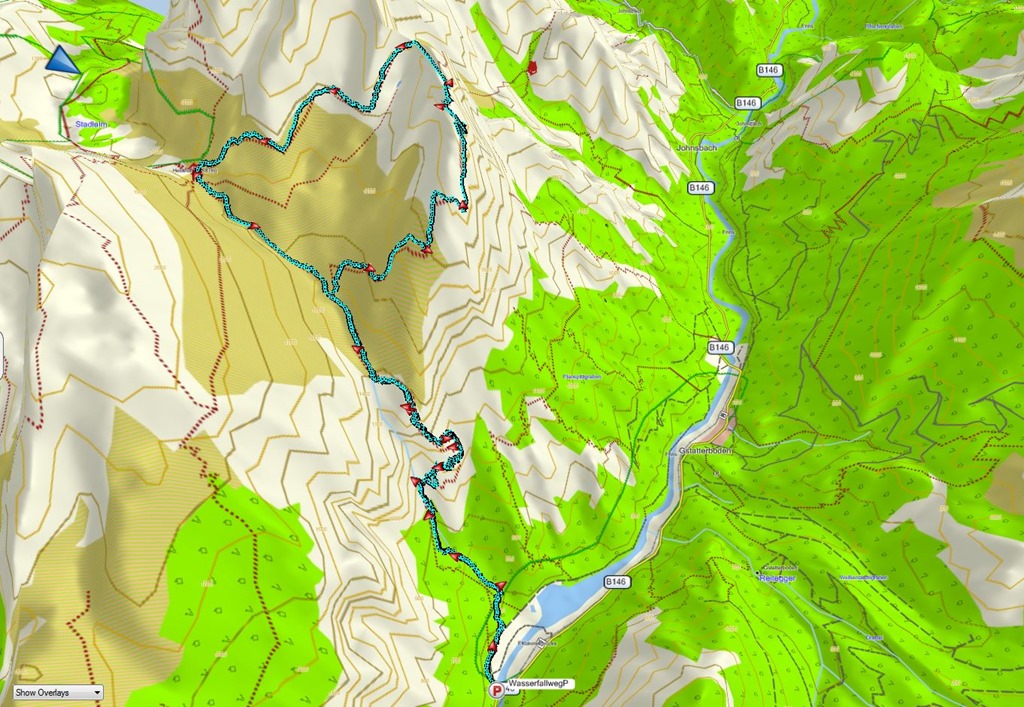 14:30-kor vagyok a Wassefallweg tetejét. Most összpontosítás következik. Jobbára a falnak fordulva mászom lefelé. A haladás a vártnál könnyebb. Szerintem könnyebb, mint a Planspitze-Hesshütte összekötő. Hja! 15:35-re érem el a Wasserfallt majd 16:20-ra érkezem vissza a Kummerbrücke kiindulópontba.