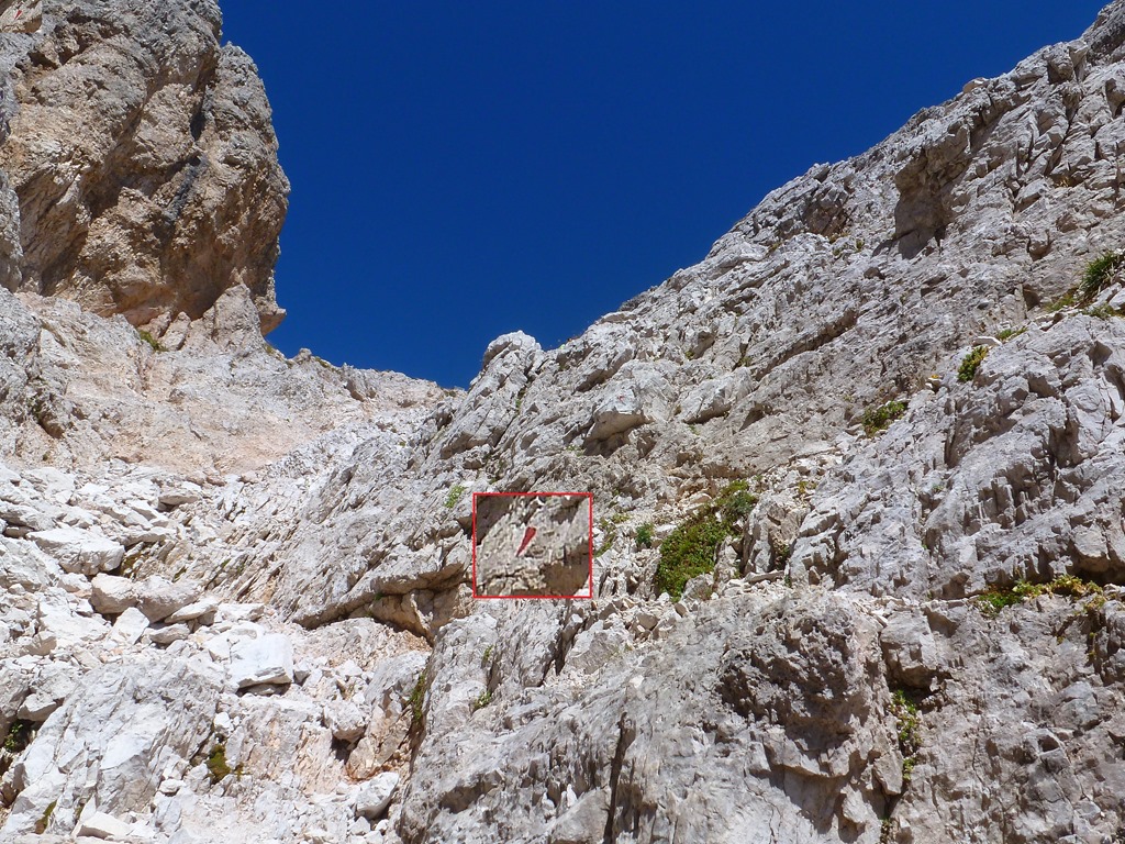 Visszapillantás a meredek Passportensteigen: kinagyítva a piros nyíl a sziklán, lefelé mutat