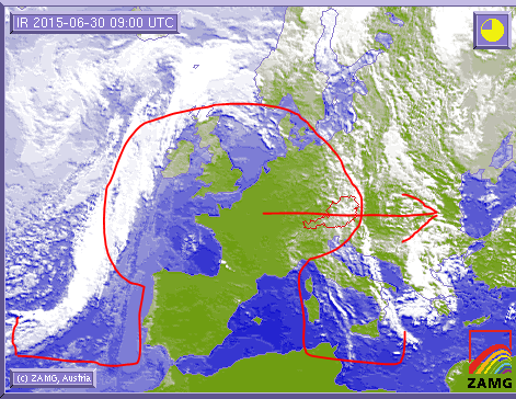 … mármint a tipikus magsnyomású ómega időjárási helyzet, mely száraz napos időt hoz Európa középső része fölé. Az ómega lassú mozgása kelet felé nyíllal jelzett. Túrázok! Keletterezők! Hegymászók! Készítsétek a bakancsokat, karabinereket, eljött a mi óránk!