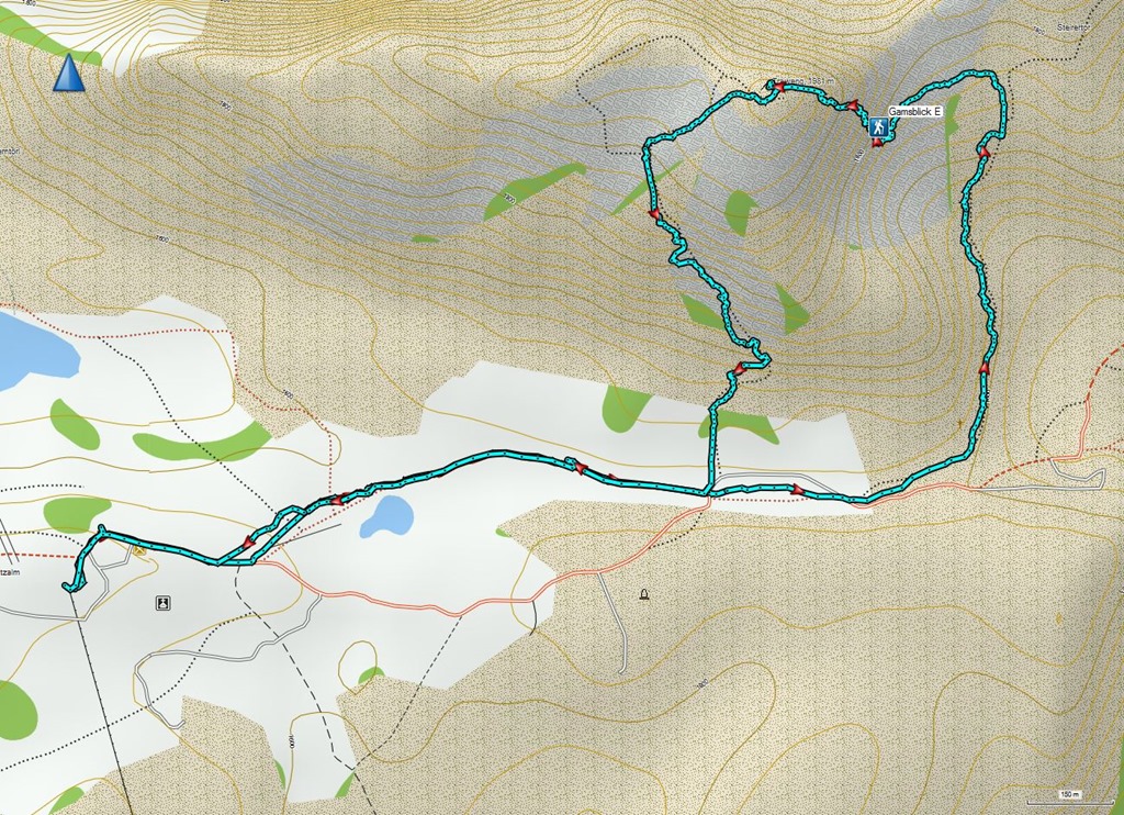 Elég gyorsan, két és háromnegyed óra alatt érem el a még tekintélyes 1525 méteres magasságban fellelhető menedékházat. Tehát éppen az erdőhatáron vagyok. Itt pihenek egy negyedórányit, iszom, és csak ezután kezdem meg a végső leszállást a völgybe. A táblának, mely másfél órában adja meg a távot, eddigi tapasztalataim alapján nem hiszek. Mint kiderül, vagy én vagyok lassú ereszkedő, vagy az információ helyes, mert szinte percre másfél óra elérni a Bodenbauer parkolóját.