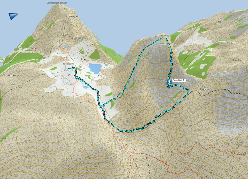 Kétórányi kaptatás után a Trawiestal keleti végében az ösvény végre a Hochschwab napsütötte déli falai felé veszi az irányt. Az ismerős törpefenyős környezet itt mégis más benyomást tesz rám. A magány, az egyedüllét, a távolság szinte tapintható. Ragyog a nap, az ég a legszebb kékjét mutatja, és én mégis kissé megremegek, amikor megpillantom a G’hackte vélhető vonalát egy szilaj hasadékban. Tényleg ott akarok feljutni? Egy piros pöttyöt fedezek fel az áthajlás koronázta résben. Valaki éppen küzdi fel magát.
