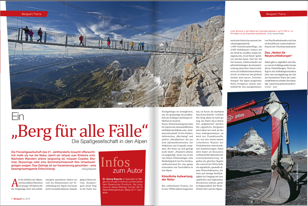 Egyébként a jelenség olyannyira általános, hogy szinti már-már cikis megemlíteni is. Hisz itt vannak a síterepek a sífelvonók hadával, teszik mindezt egész éven át, megállás nélkül. Az Alpok érzékeny természeti környezetébe történő brutális és korlátlan behatolásnak drámai következményei vannak. A szórakozásorientált társadalom (Spassgesellschaft == cirkuszt és kenyeret) és a profit minden határon túl történő hajszolása már nem elégszik meg csupán csak a tömegek utaztatásával, hanem durva építmények egész seregével, indít hatásvadász rohamot a még gyorsabb, még hatékonyabb gazdasági növekedés érdekében. A hegy puszta kulisszává degradálódik, a túrázás unalmas foglalatossággá nyilváníttatik a legújabb szenzációk tükrében (mint például a semmibe vezető függőhíd a Dachsteinen – lásd az alábbi képen). Az ilyen és ehhez hasonló negatív jelenségekről szól a Bergaufban az Osztrák Alpesi Szövetség legfrissebb kiadásában írott cikkében Georg Bayerle. Az írás címe Berg für alle Fälle (avagy szabadfordításban “A szórakozásorientált kultúra az Alpok egészére kiterjedő pusztításáról”). Milyen rettenetesen igaza van!