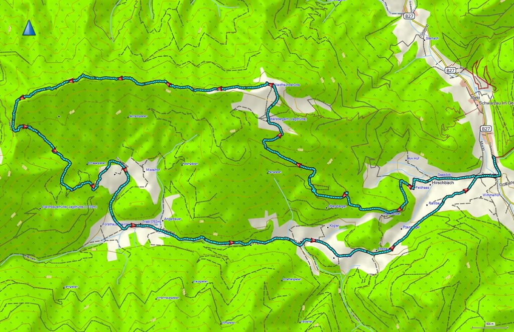 | Gpx-nyomvonalam kérésre hozáférhető. A táv (Kaumberg, Araburg, Kölchberg, Rotes Kreuz, Hocheck, Höfnerhaus, Kaumberg) cirka 20 km, 1300m szintemelkedés, bruttó 7:00 óra. |