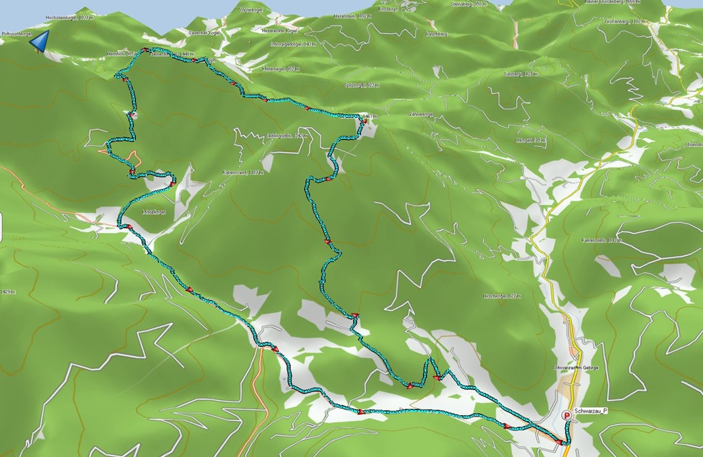 Lassítok és latolgatom az esélyeimet. Nem fordulok azonnal vissza. A döntést majd Schwarzauba érve hozom meg. Alig fordulok Schwarza patak völgyébe, permetté oszlik az eső, majd elhaladva községet jelző tábla mellett, el is áll. A betegség miatt éppen bezárt Gruber fogadó előtt parkolok. Kiszállok és legnagyobb meglepetésemre, édes tavaszi illatokkal telített, nedves, szélcsendes kellemes idő fogad. Körbehordom tekintetemet. Az ég egy apró sarkán még a szürke felhők is megnyílnak egy pillanatra és úgy látom, mintha egy távoli erdőhátat napfény világítaná meg.